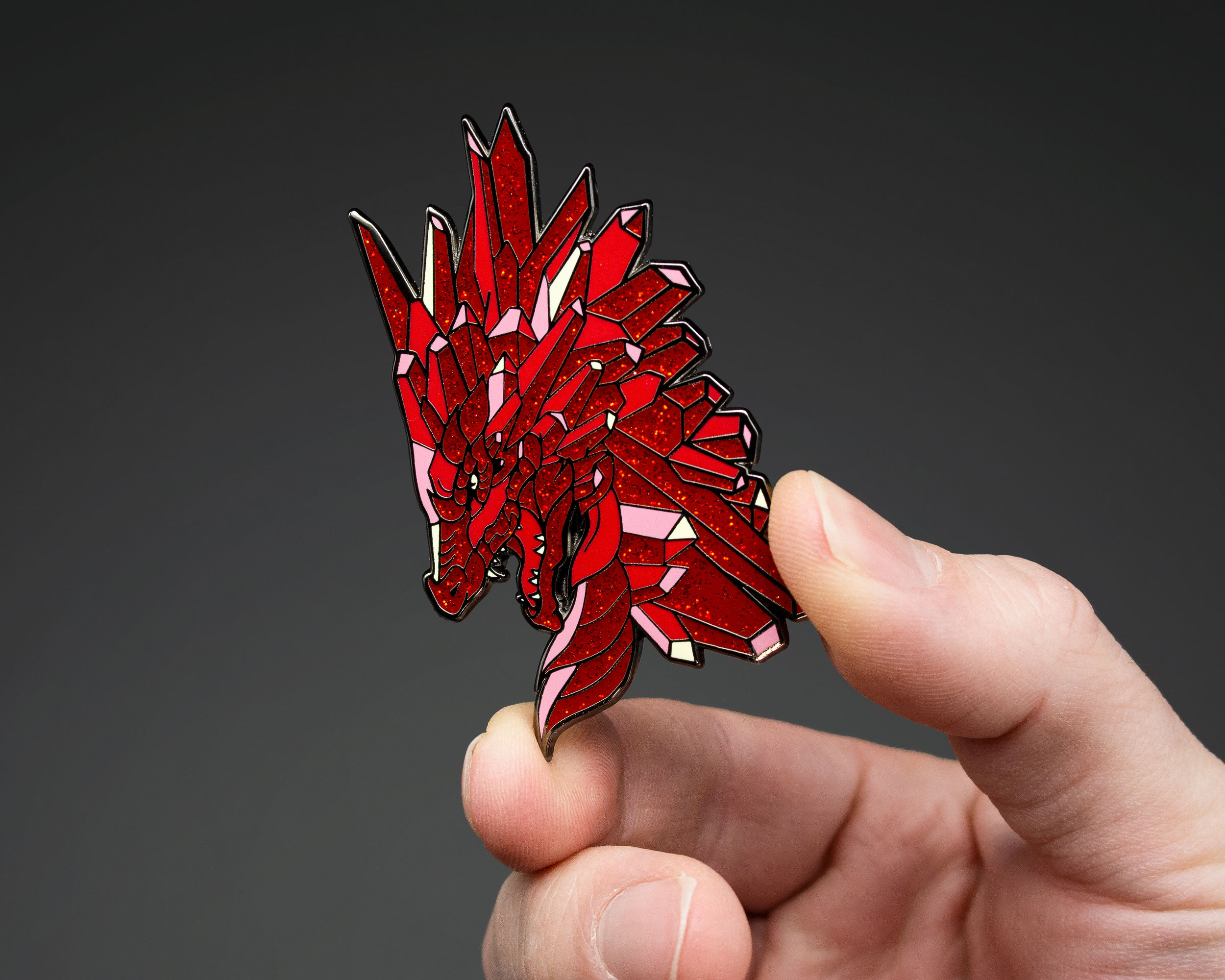 Made for our Patreon Pin-of-the-Month Club, this Ruby Dragon enamel pin from December of 2021 is truly a one-of-a-kind work of wearable art! With four colors of hard enamel and black nickel plating, this pin has stunningly vibrant colors accented with shimmering glitter details. As if this wasn't good enough, we've added an exclusive Holographic Sticker included for free with each pin! Only 150 of these limited-edition pins have been produced and will never be recreated in the same colors - once it's gone, it's gone!