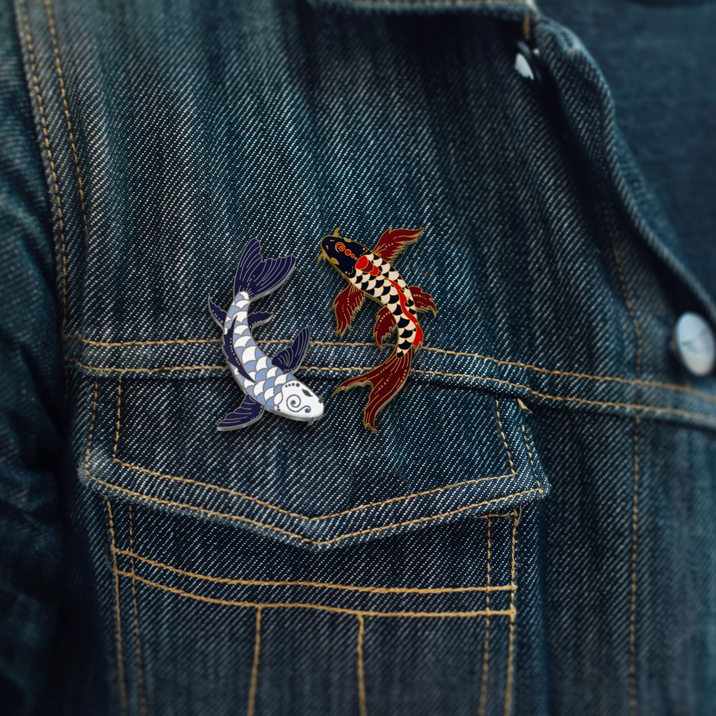 Two koi, one Dark and one Light, have each been accented with vibrantly colored enamel and distinct metal plating. This design was one of our absolute best-sellers and is finally back in stock for a limited time, grab yours while you can. Keep both pins together in a balanced pose on a board or pinned to a jacket, or separate the two, keeping one for yourself and one for a friend, family member, or loved one.