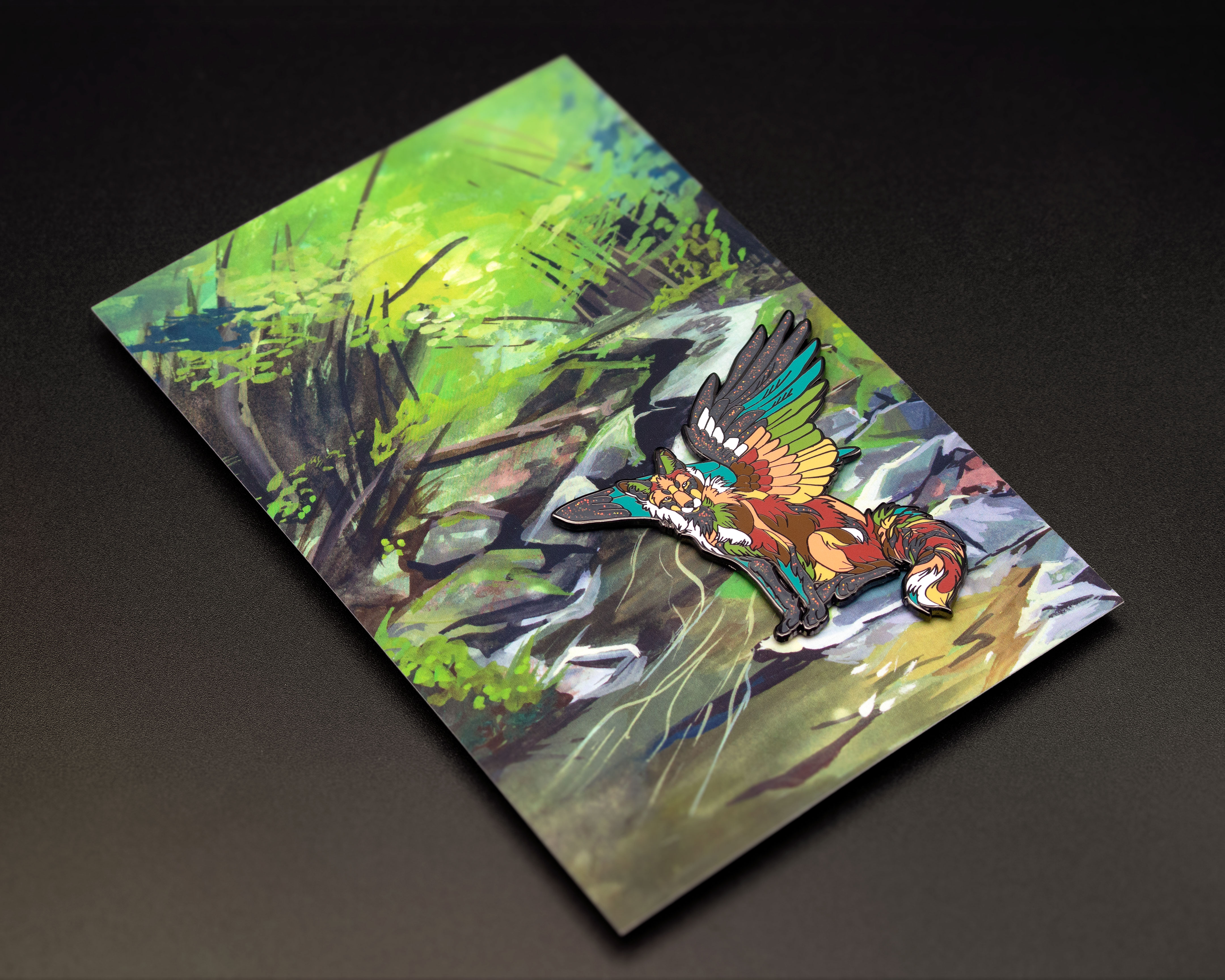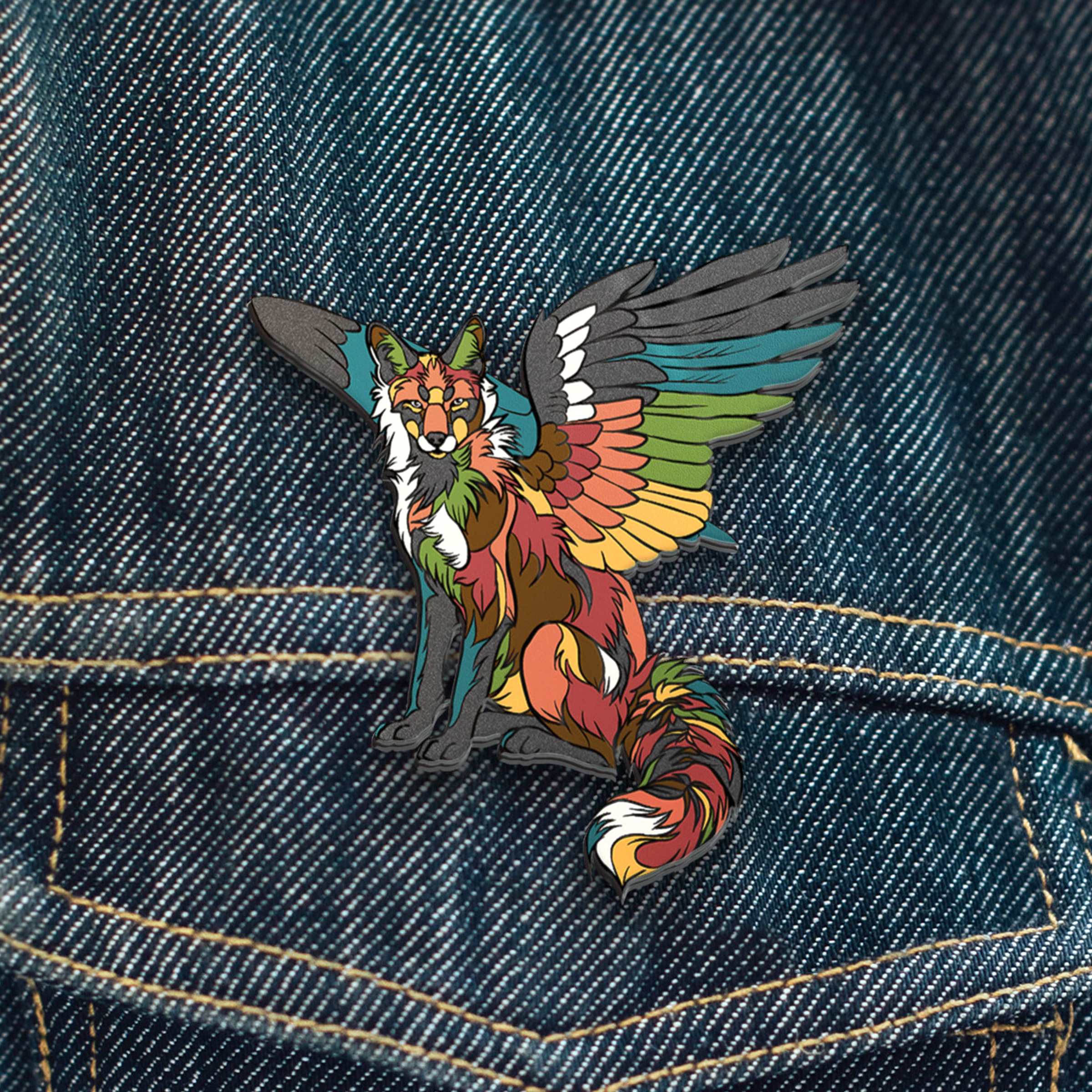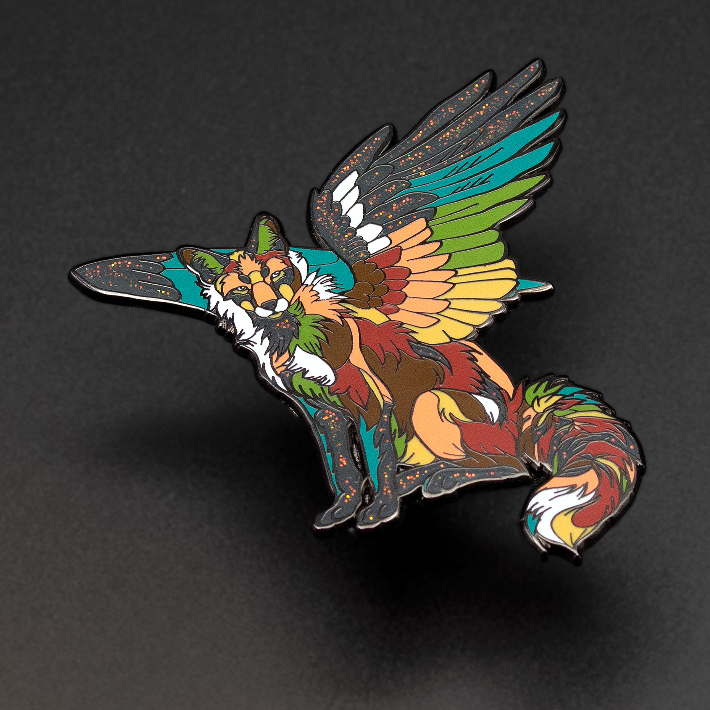 Made for our Patreon Pin-of-the-Month Club, this Winged Fox enamel pin from October of 2021 is truly a one-of-a-kind work of wearable art! With eight colors of hard enamel and black nickel plating, this pin uses vibrant colors accented with shimmering glitter details to forge a new favorite for any fan of foxes. A limited edition of only 150 pins has been produced and will never be recreated in the same colors - once it's gone, it's gone!