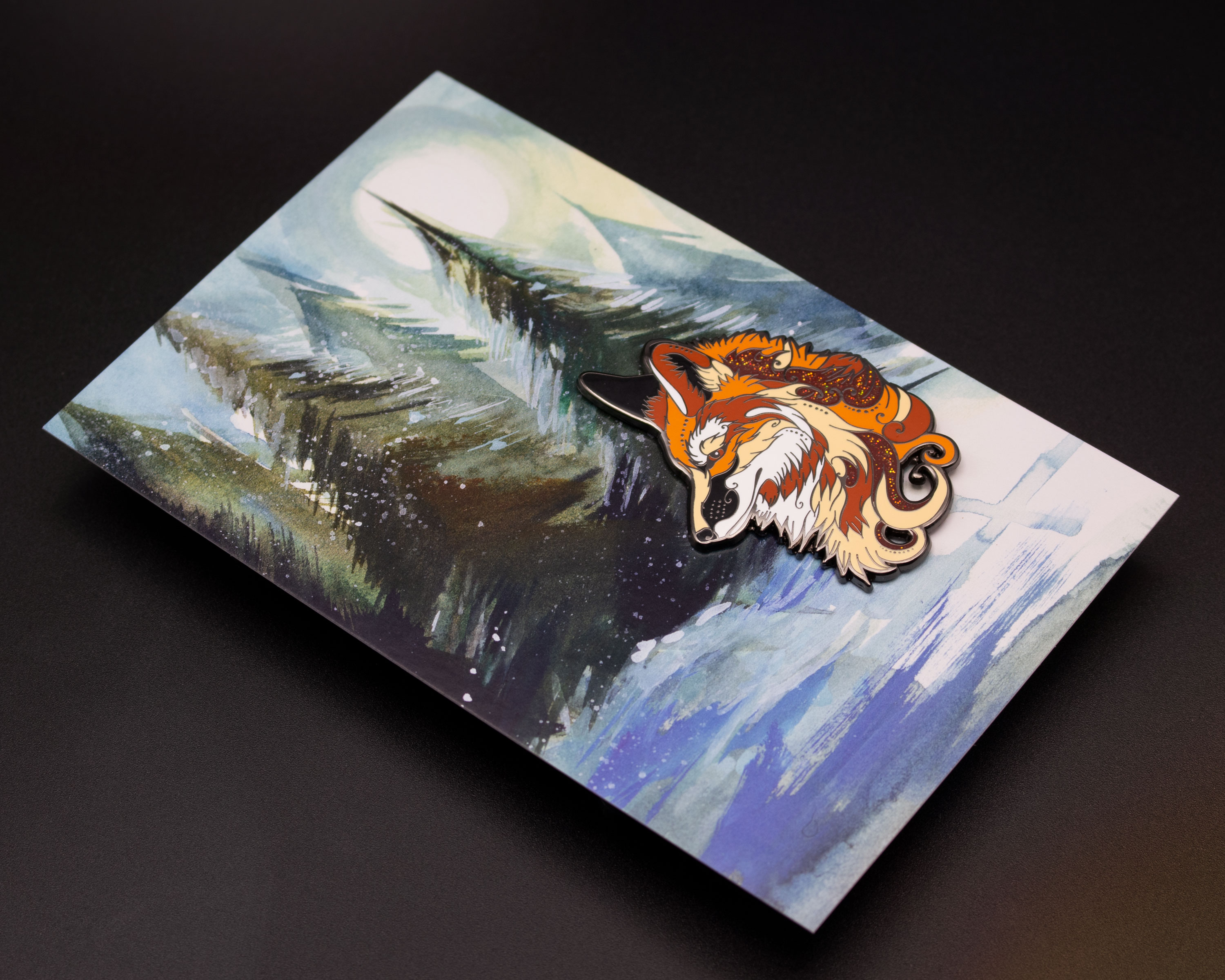 Made for our Patreon Pin-of-the-Month Club, this Red Fox enamel pin from November of 2021 is truly a one-of-a-kind work of wearable art! With six colors of hard enamel and black nickel plating, this pin uses vibrant colors accented with shimmering glitter details to forge a new favorite for any fan of foxes. A limited edition of only 150 pins has been produced and will never be recreated in the same colors - once it's gone, it's gone!