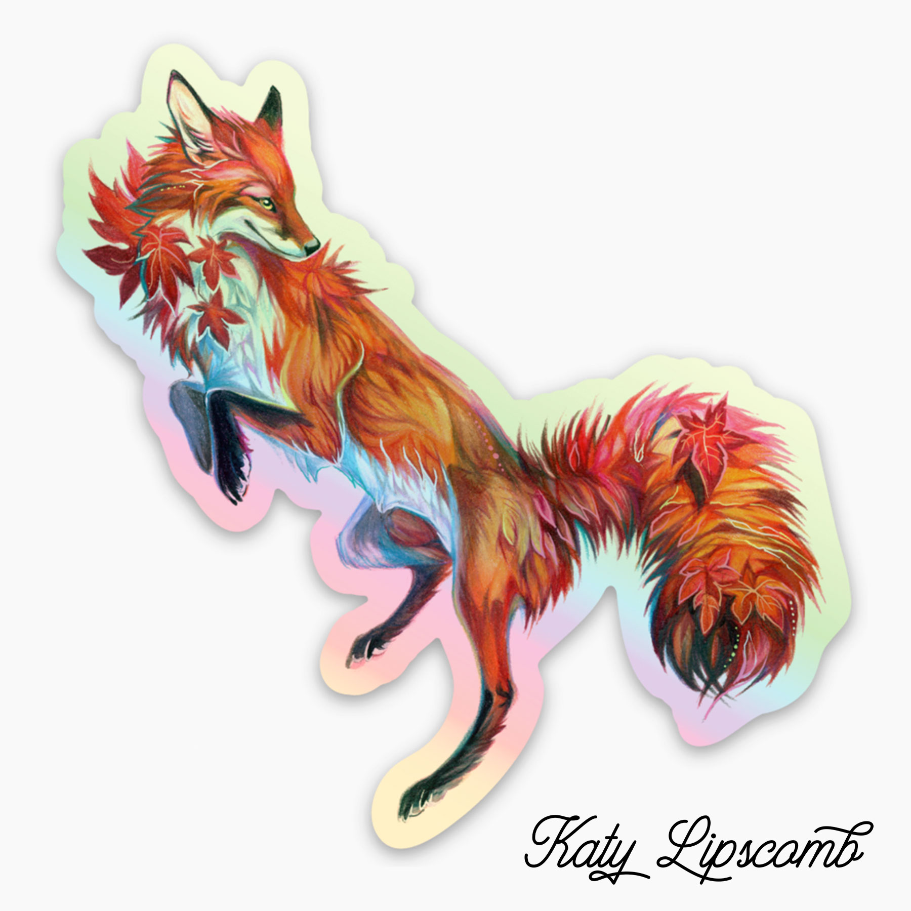 This design, the small size of our Holo Japanese Maple Fox, measures approximately 3.5 inches by 2.25 inches. Experimental techniques result in a stunning holographic effect, creating a metallic oil-slick appearance that changes color depending on how you view it!