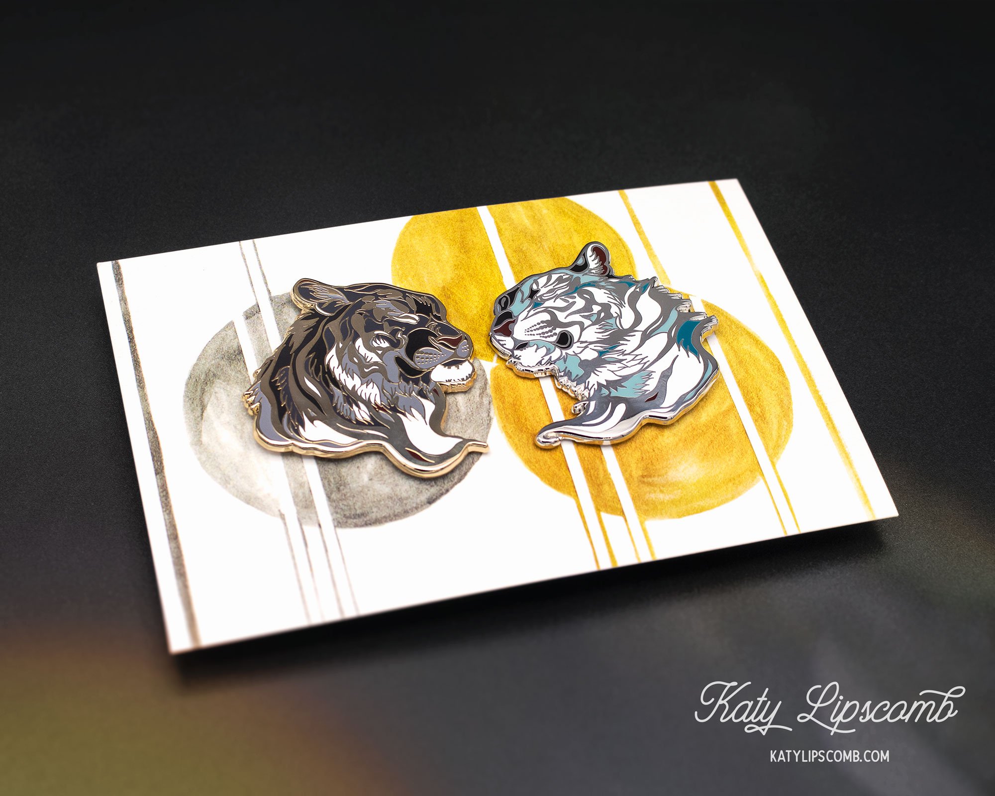 Made for our Patreon Pin-of-the-Month Club, the two enamel pins from March and April of 2022 make a stunning Duality Tigers Set! With five colors each of hard enamel and polished gold & silver colored plating, these pins are truly a one-of-a-kind work of wearable art.