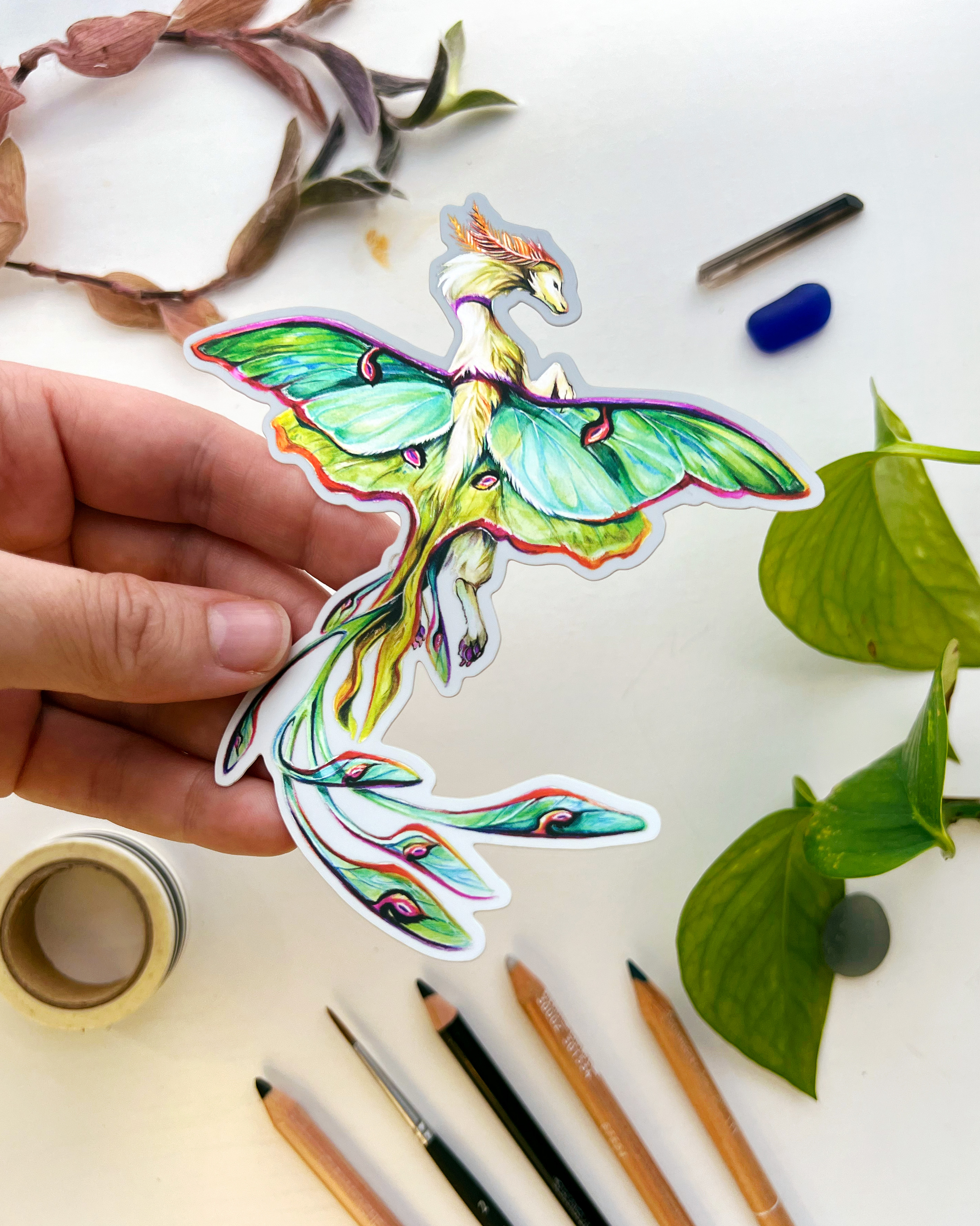 Turn heads and spark your imagination with our holographic vinyl stickers featuring animals and fantastical creatures brought to life in our signature watercolor and colored pencil style. These eye-catching designs are elevated with a stunning “oil slick” holographic effect, creating a rainbow shine that shifts and sparkles as it catches the light. The holographic accents are thoughtfully applied to specific elements of each design, enhancing the subject’s details while leaving the border and background crisp and clear.
