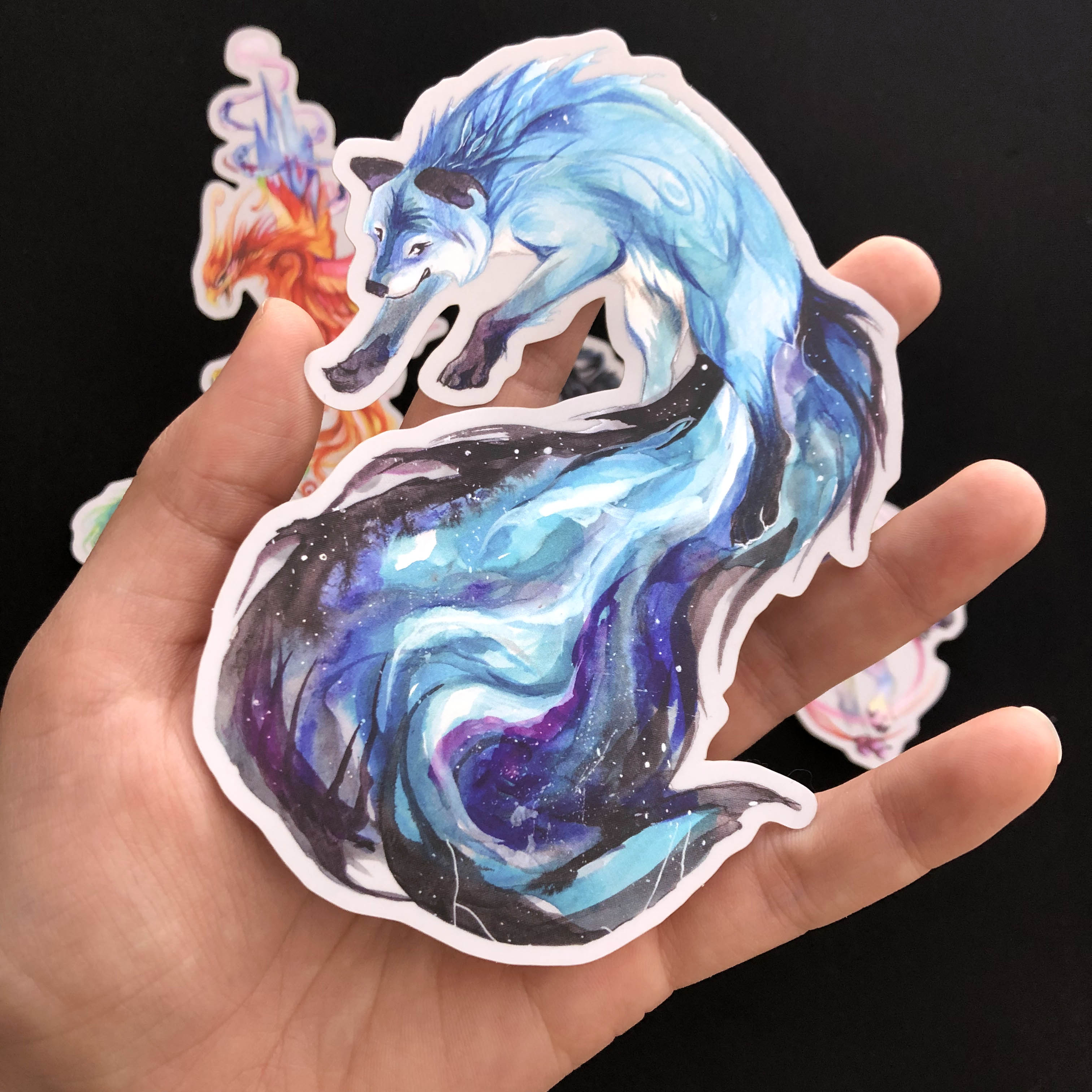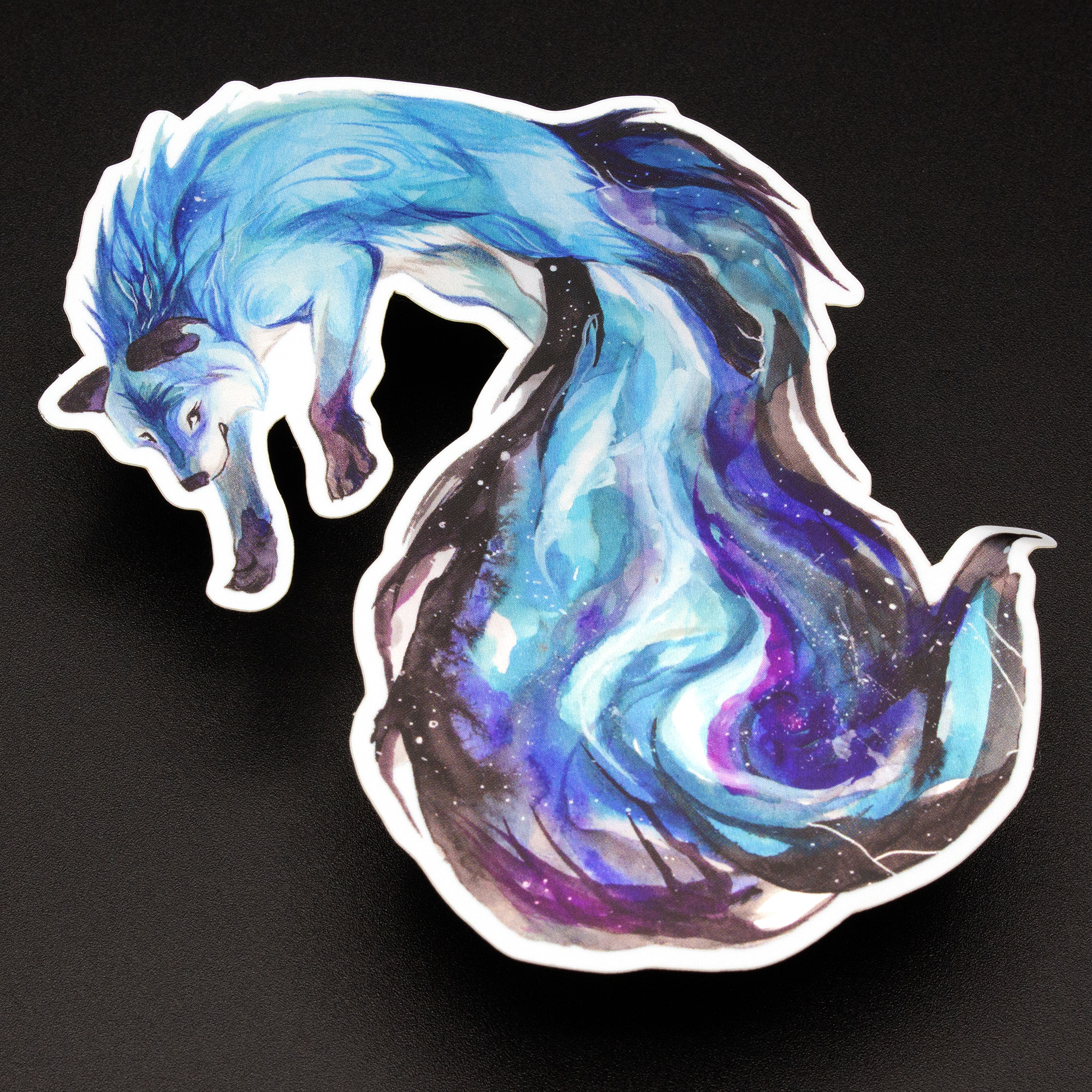 This design, our holo Galaxy Fox, measures approximately 4.5 inches by 3 inches. Experimental techniques result in a stunning holographic effect, creating a metallic oil-slick appearance that changes color depending on how you view it!