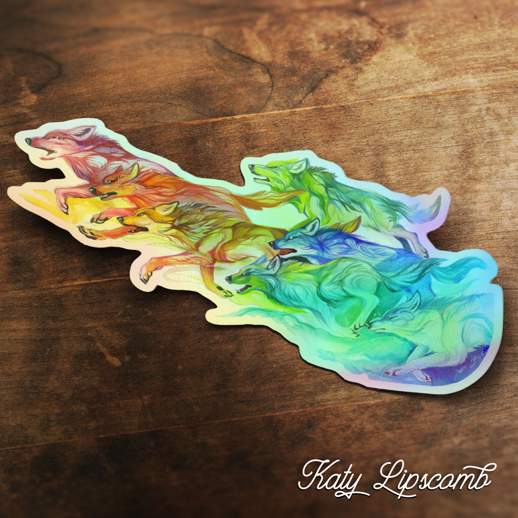 This design, the large size of our Wolf Pack, measures approximately 6 inches by 3 inches. Experimental techniques result in a stunning holographic effect, creating a metallic oil-slick appearance that changes color depending on how you view it!