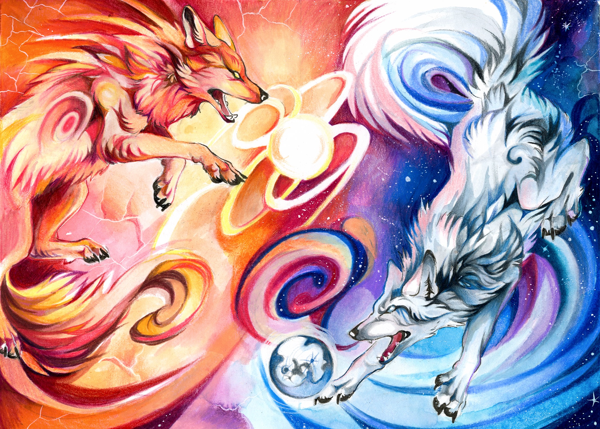 This interpretation of two wolves from norse mythology features Hati and Skoll chasing the sun and moon. The pins measure approximately 2 inches by 4 inches and are mounted on a custom 5x7 backer card. Hati features Gold-toned Metal Plating and Embedded Glitter detail to highlight his solar aspirations. Skoll features Silver-toned Metal Plating and Glow-in-the-dark colors to show off his lunar theme. Both pins have our signature debossed on the back and are supported by double metal posts with rubber clutches.
