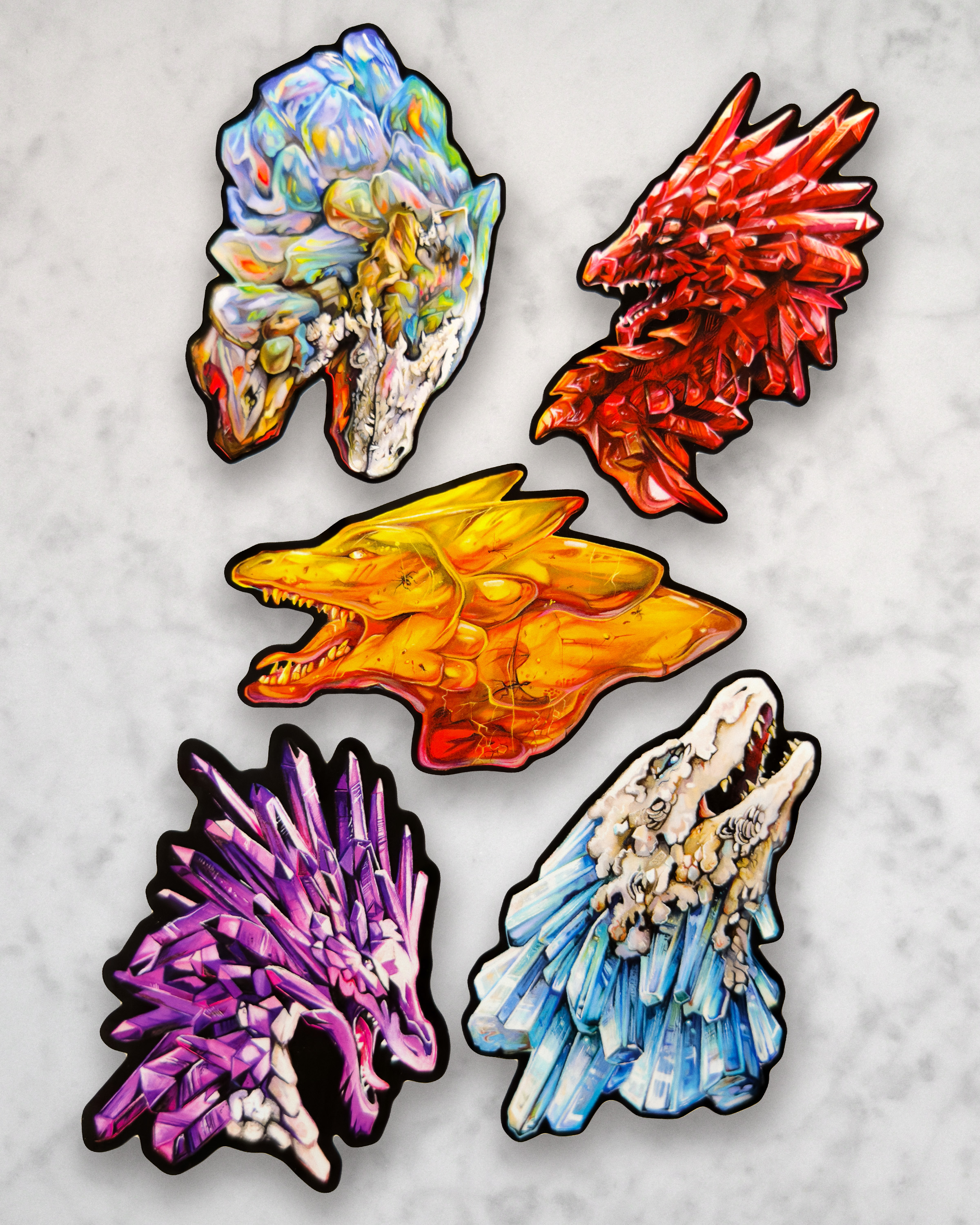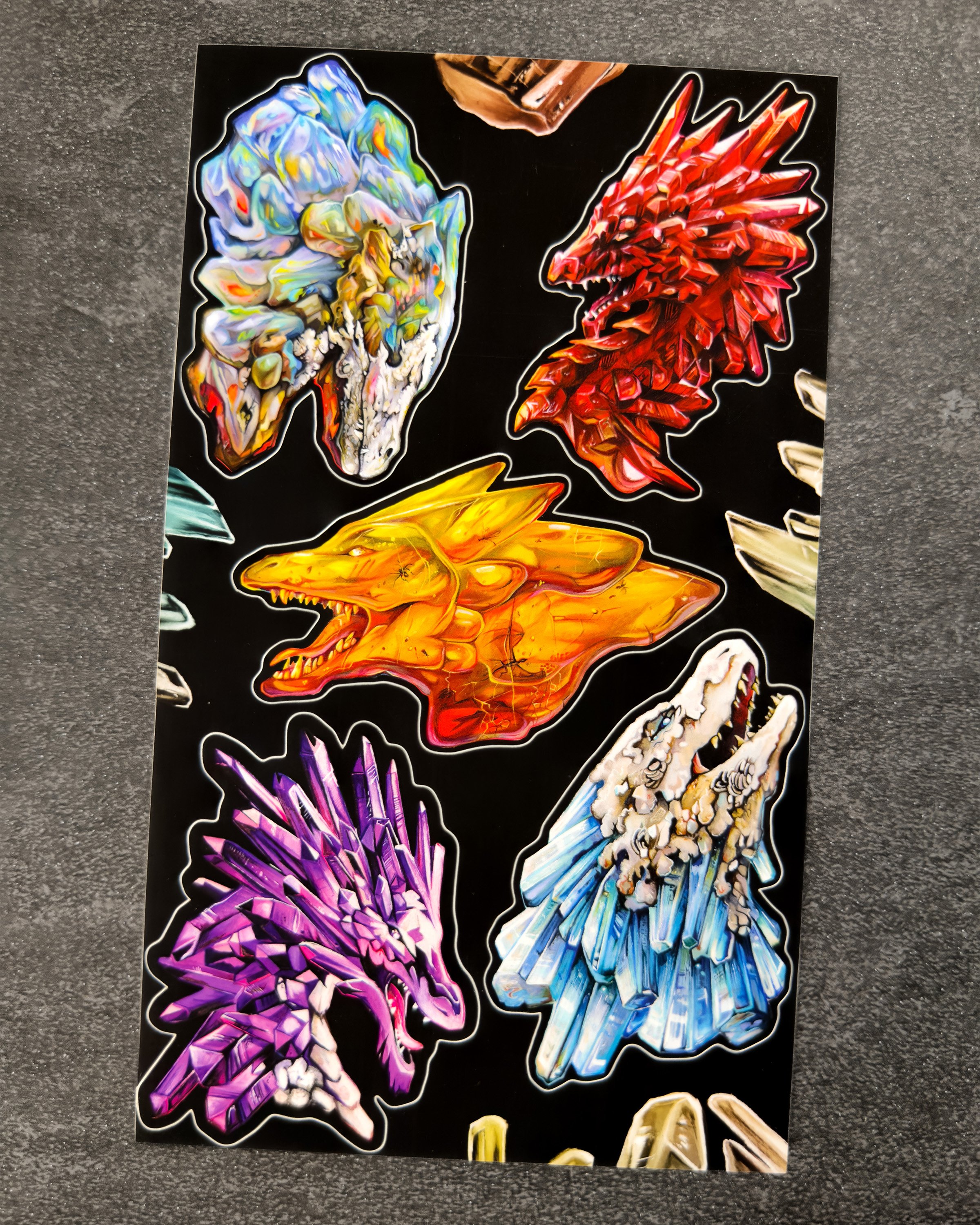 Our new jumbo sticker sheets are huge, matte, and beautiful! Measuring an impressive 5” x 8.5” (nearly double the surface area of our classic 4” x 6” sheets), our new Gemstone Dragon Sticker Sheet showcases several of Katy Lipscomb's original crystal dragons. Each dragon is inspired by real-world gems, crystals, and structures, from the glowing Opal to fiery Ruby. That’s five stickers in total, all carefully arranged to spark delight the moment you peel one off!